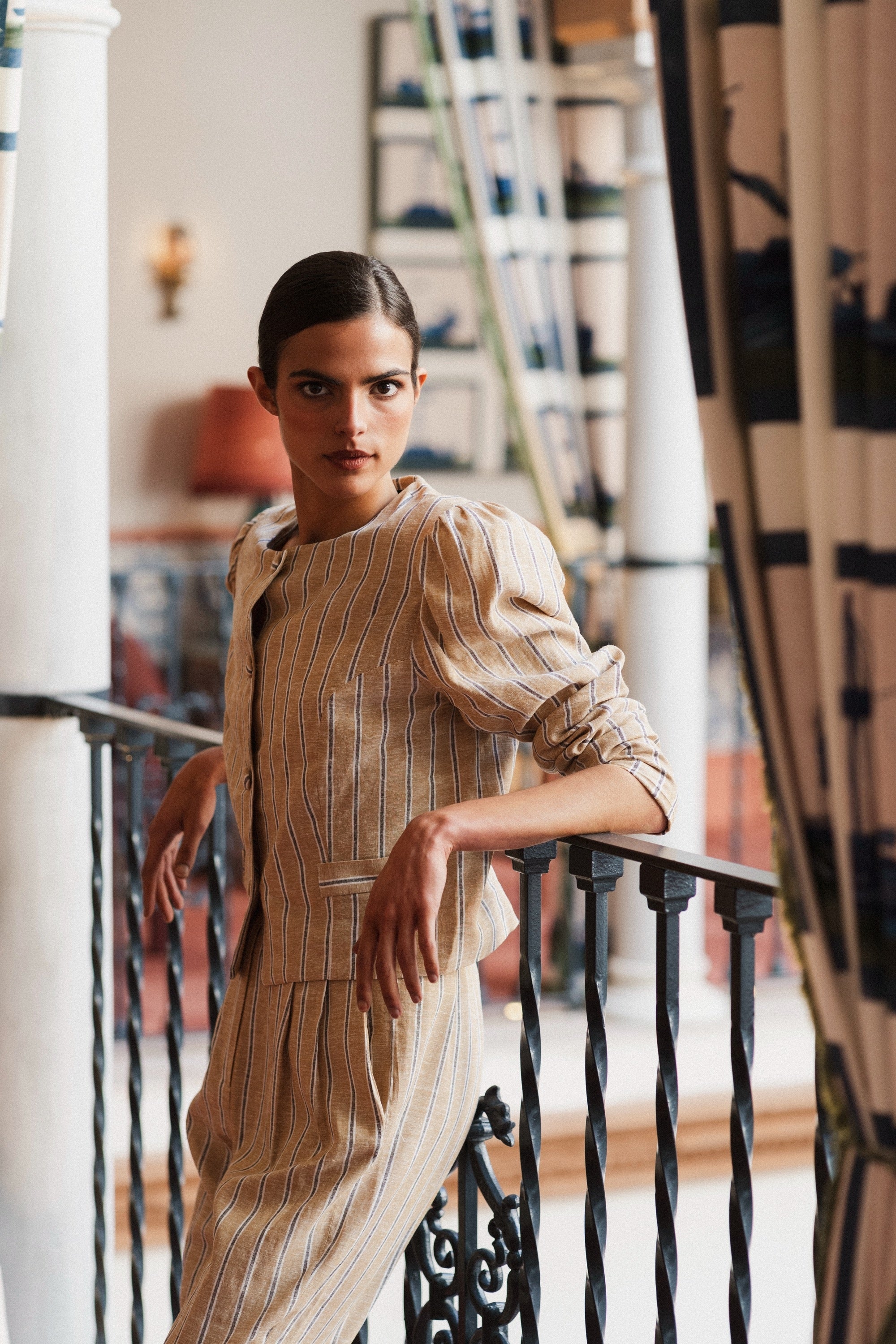 La torera Josefa beige ocre rayas pertenece a la sección de chaquetas de fiesta y casual de la nueva colección de Barey SS26.