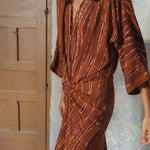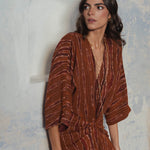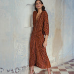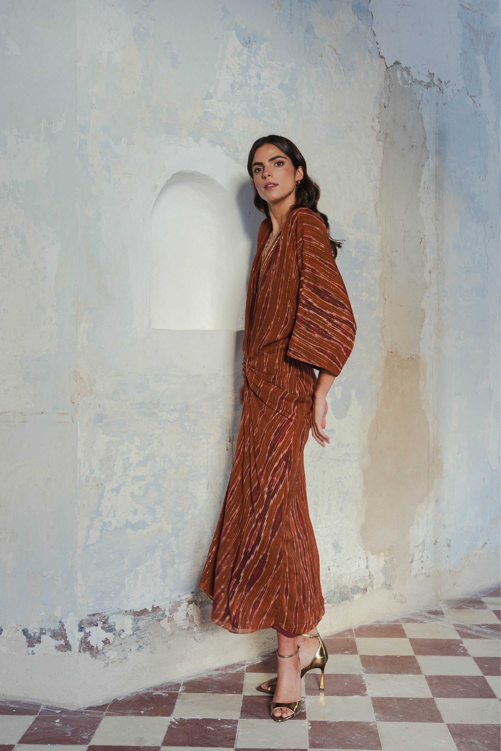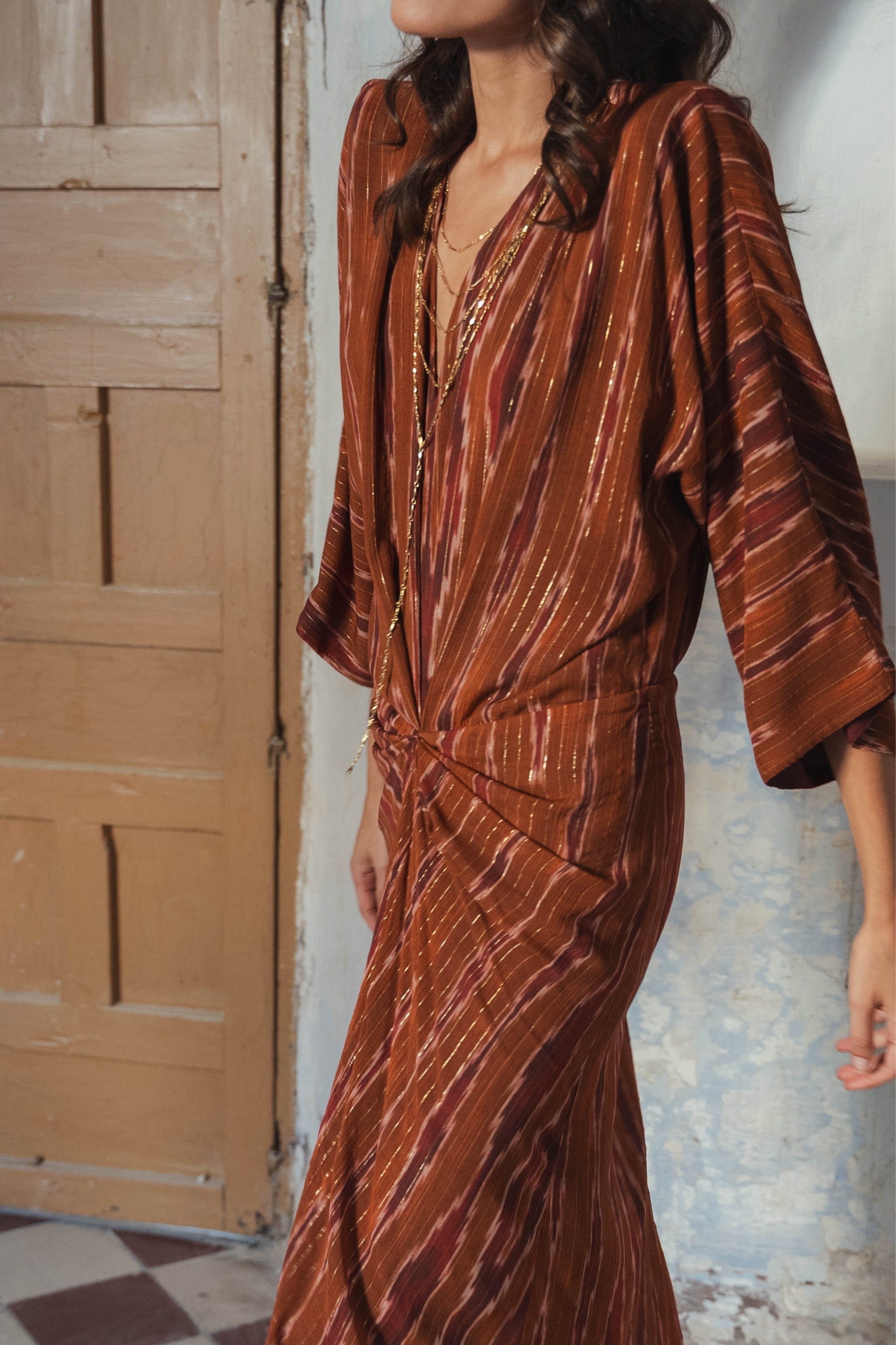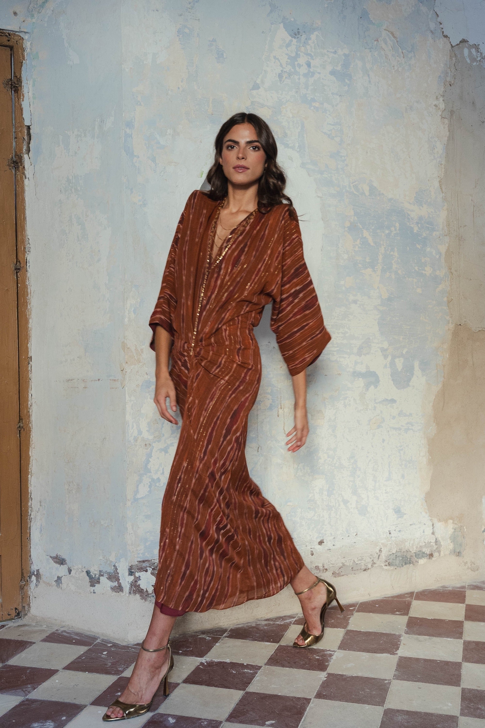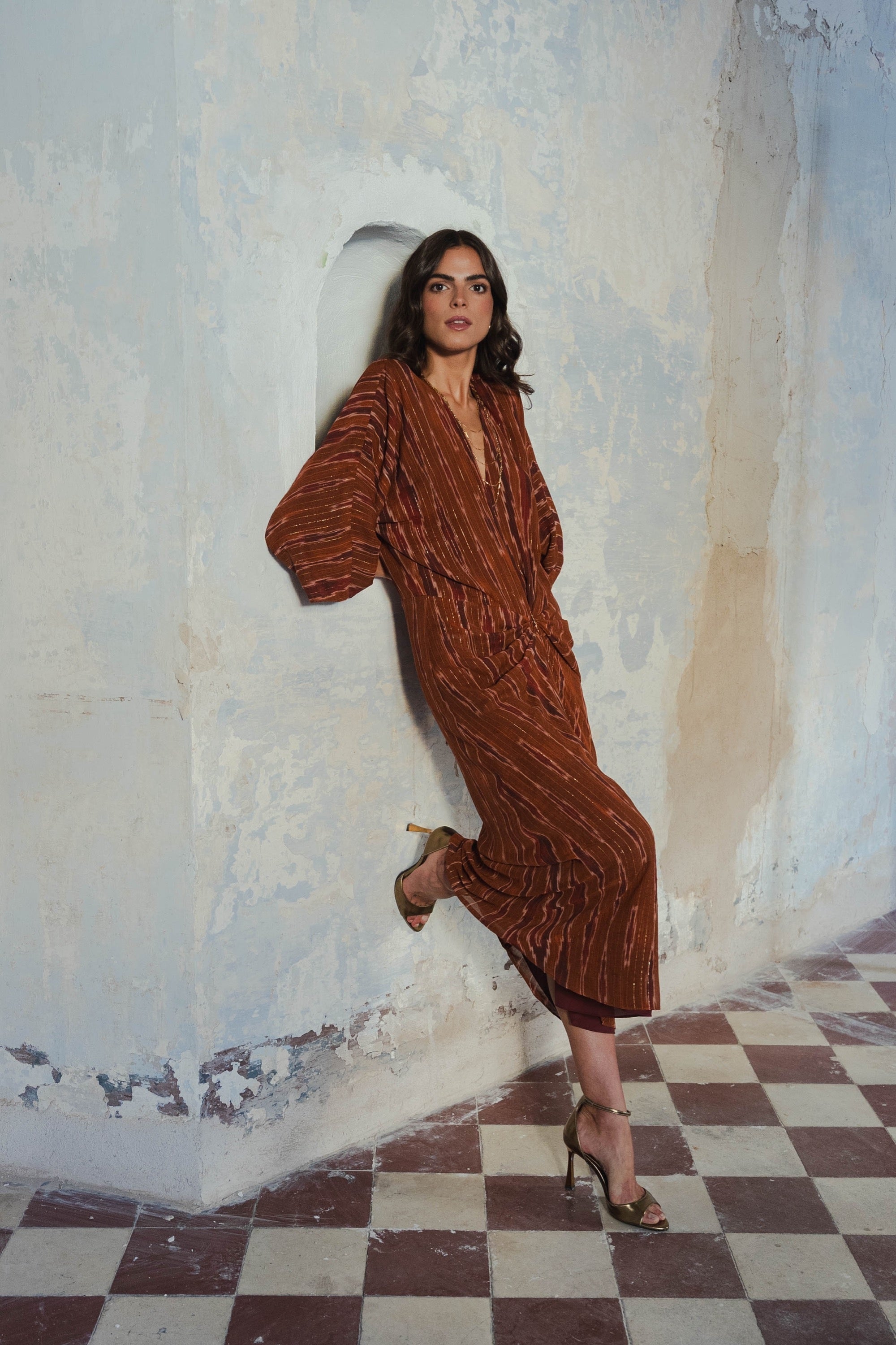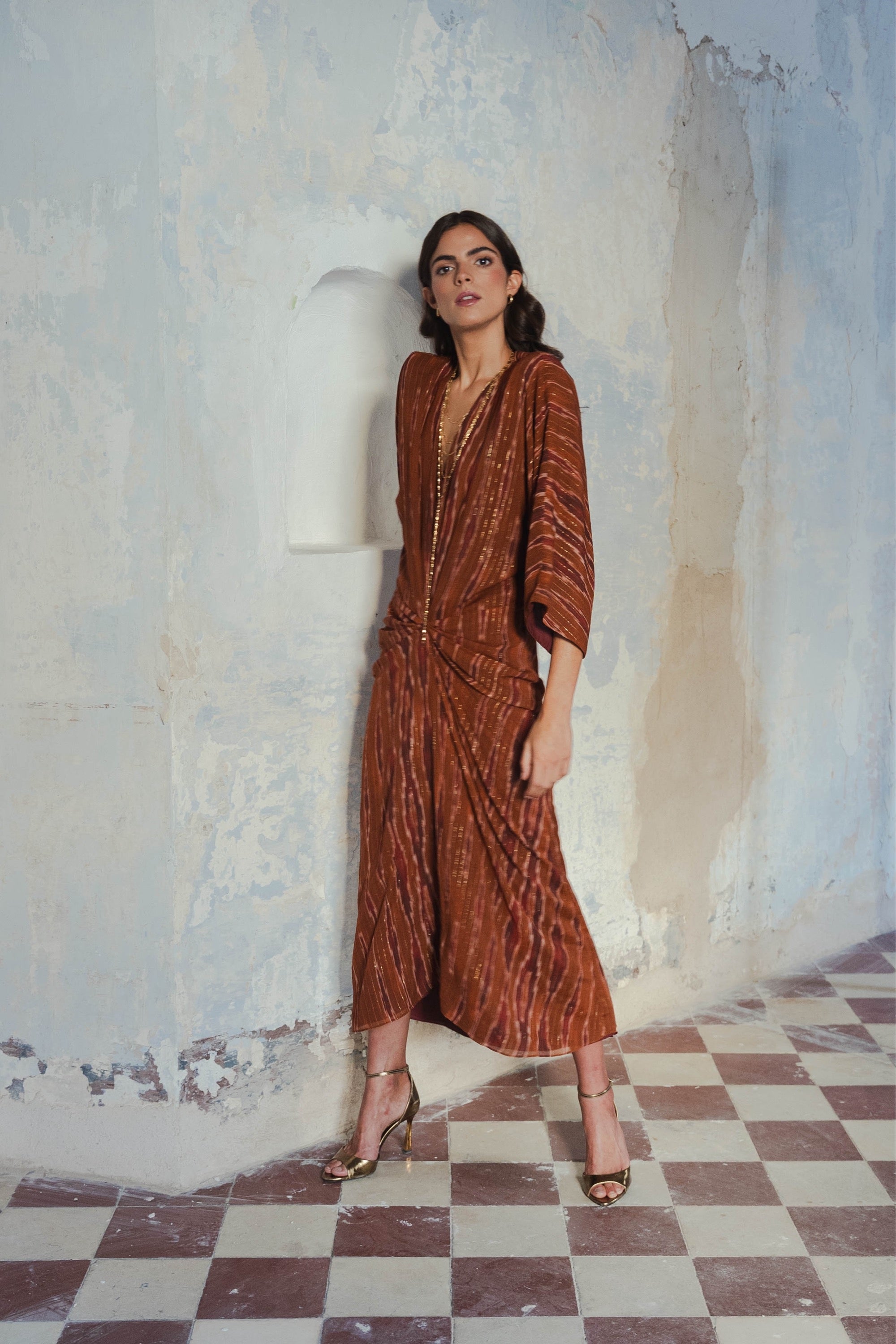 Dress made of Viscose, caldera and burgundy ikat print with metallic gold thread, V-neckline, central draping, long cape sleeves, shoulder pads. A-line cut, asymmetric midi length and matching chiffon lining.